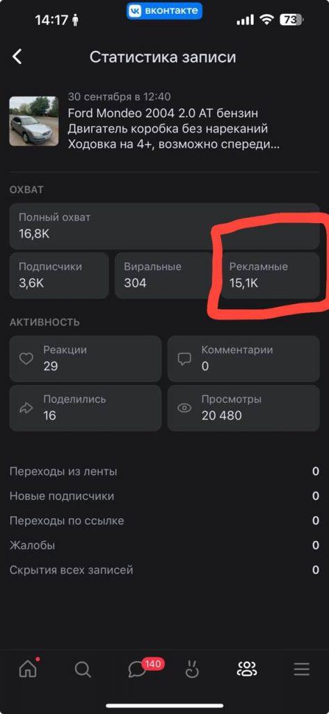 Итог: Пост с Ford Mondeo 2004 получил 105 тысяч просмотров что является в 15+ раз больше показов чем “Бесплатная публикация авто”